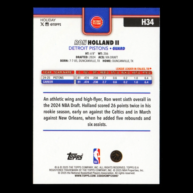 Ron Holland II 2025-26 Topps Holiday Glitter Holiday Pistons
