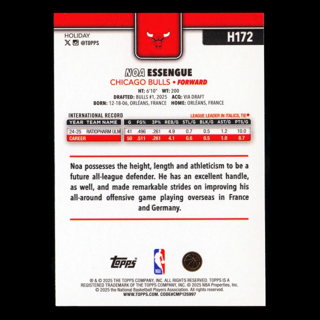 Noa Essengue RC 2025-26 Topps Holiday Rookie Bulls