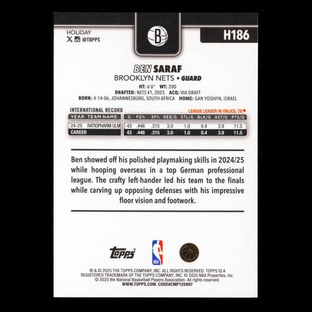 Ben Saraf RC 2025-26 Topps Holiday Rookie Nets