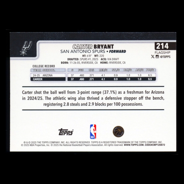 Carter Bryant RC 2025-26 Topps Rookie Spurs