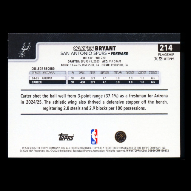 Carter Bryant RC 2025-26 Topps Rookie Spurs