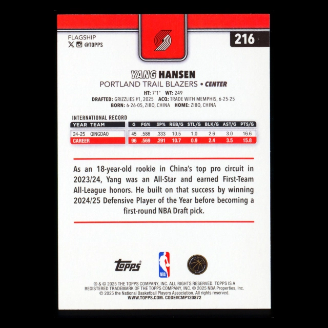 Yang Hansen RC 2025-26 Topps Rookie Trail Blazers