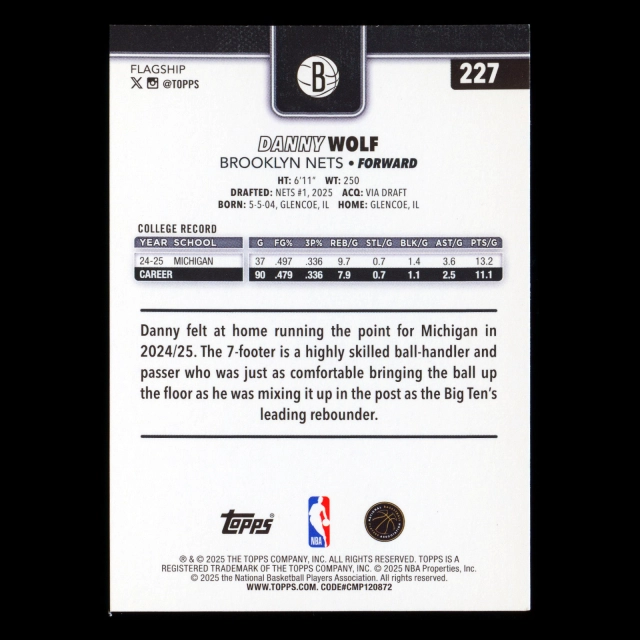 Danny Wolf RC 2025-26 Topps Rookie Nets