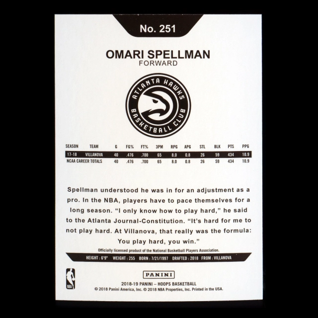 Omari Spellman RC 2018-19 Panini NBA Hoops Rookie Hawks