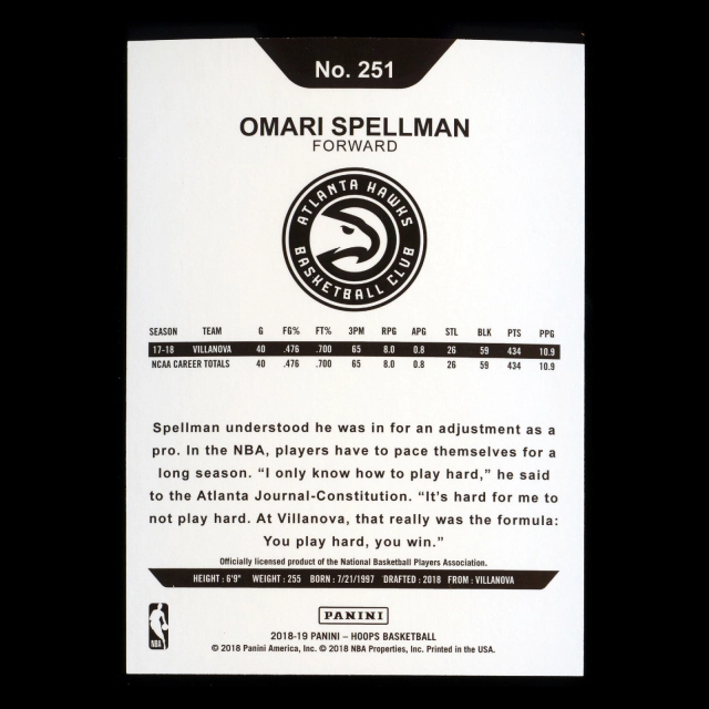 Omari Spellman RC 2018-19 Panini NBA Hoops Rookie Hawks