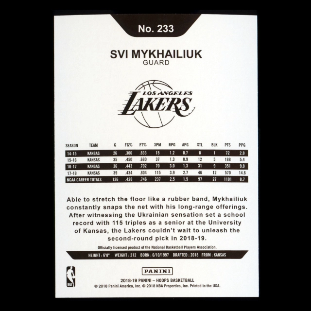 Svi Mykhailiuk RC 2018-19 Panini NBA Hoops Rookie Lakers