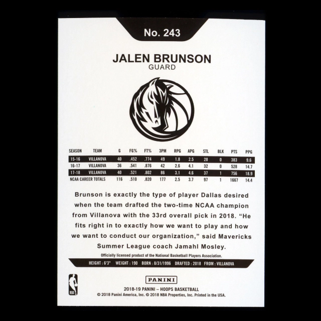 Jalen Brunson RC 2018-19 Panini NBA Hoops Rookie Mavericks