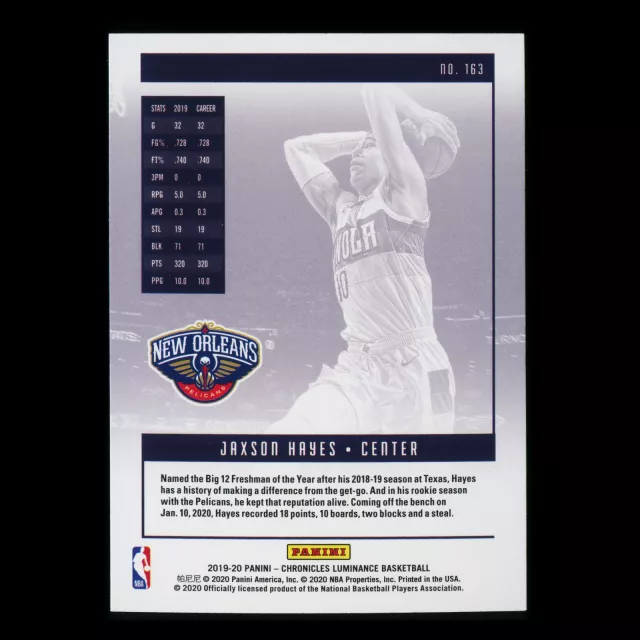 Jaxson Hayes RC 2019-20 Chronicles Luminance Rookie Pelicans