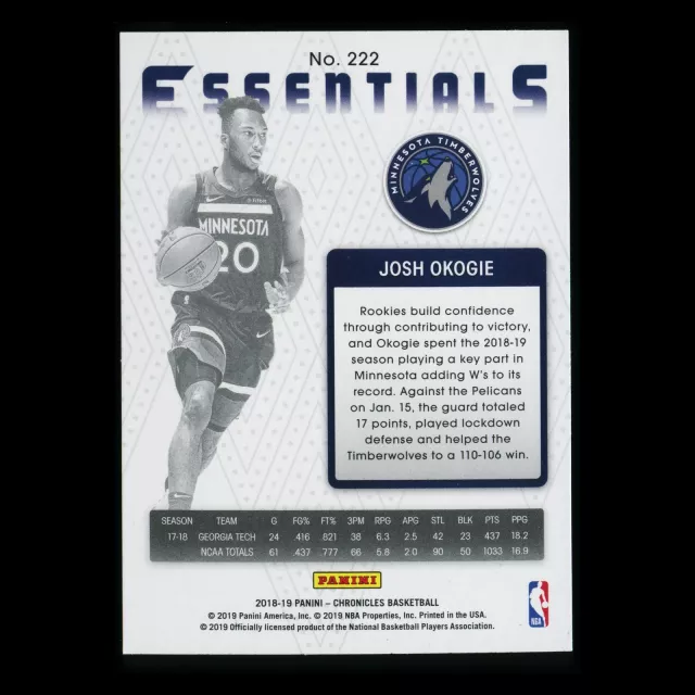 Josh Okogie RC 2018-19 Chronicles Essentials Rookie Timberwolves