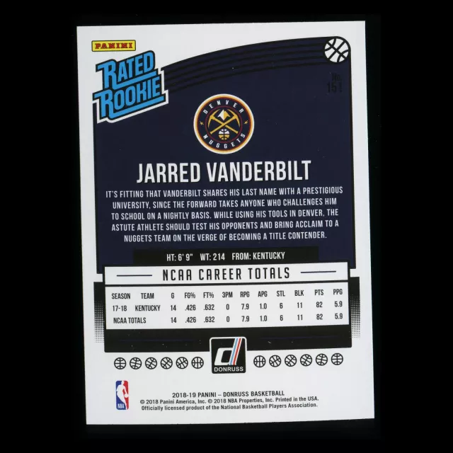 Jarred Vanderbilt RR 2018-19 Donruss Rated Rookie Nuggets