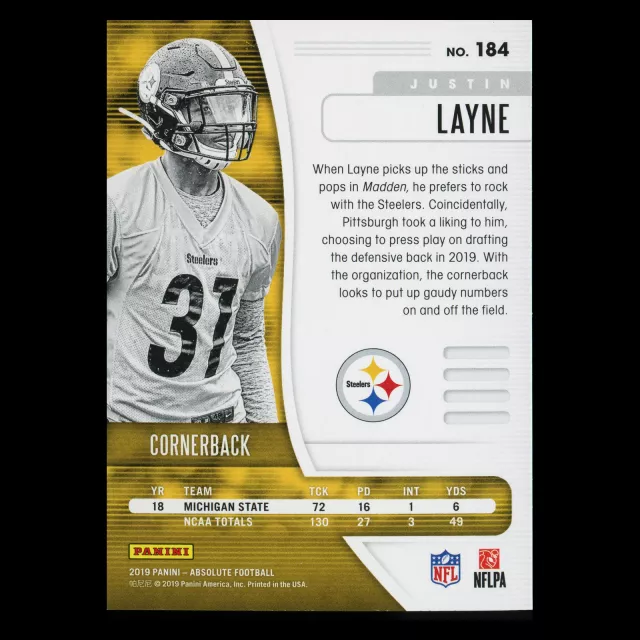 Justin Layne RC 2019 Absolute Rookie Steelers