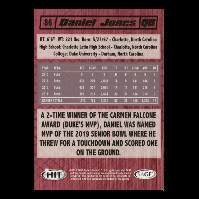 Daniel Jones 2019 HIT Premier Draft Rookie Blue Devils/Giants