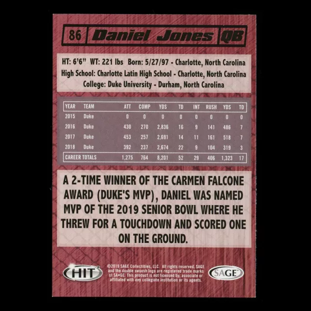 Daniel Jones 2019 HIT Premier Draft Rookie Blue Devils/Giants