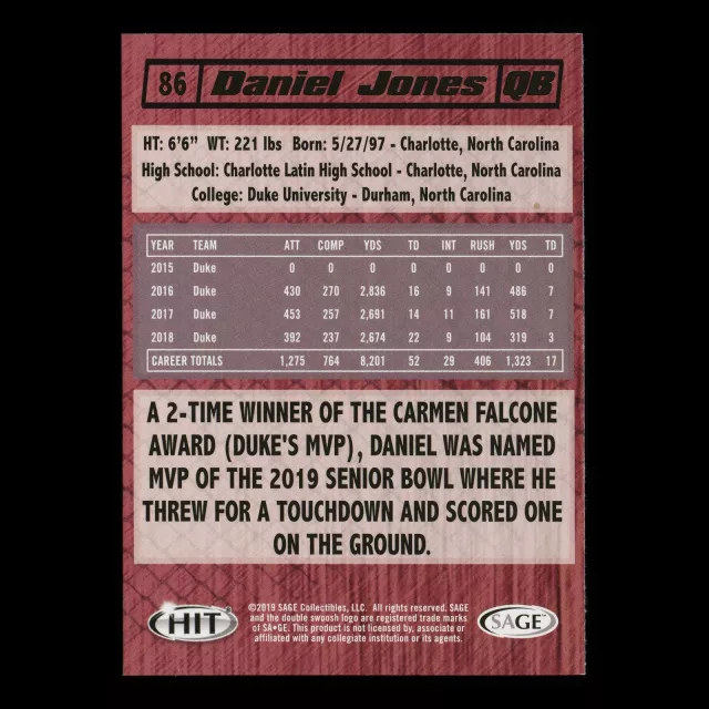Daniel Jones 2019 HIT Premier Draft Rookie Blue Devils/Giants