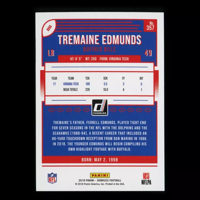 Tremaine Edmunds RC 2018 Donruss Rookie Bills